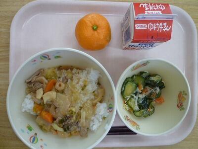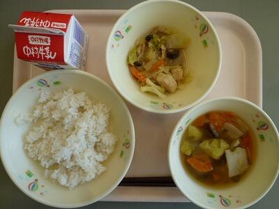≪麦ごはん いもっこ汁 鶏肉のちゃんちゃん焼き 牛乳≫
