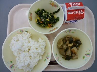≪麦ごはん 鶏肉と大豆の煮物 ほうれん草とコーンの和え物 牛乳≫