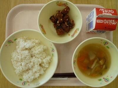 ≪麦ごはん きのこ汁 魚のピーナッツからめ 牛乳≫