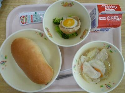 ≪ミルクパン ラビオリスープ スコッチエッグ ブロッコリー ケチャップ 牛乳≫