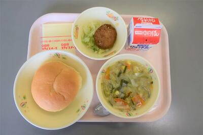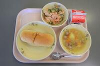 今日のこんだては、「バーガーパン」「牛乳」「バーガー用ハンバーグ・キャベツ・スライスチーズ」「白菜スープ」です。セルフバーガーの給食です。大きくてとても食べ応えがあります。汁物としての白菜スープは、白菜のうまみとコーン・ベーコンの甘みがとてもよく、温かいスープとともにお腹を満たしてくれます。