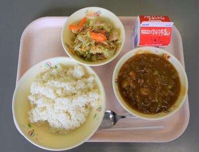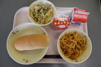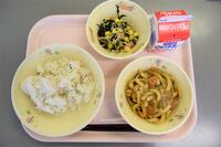 今日のこんだては、「減量うめなご飯」「牛乳」「カレーうどん」「もやしと小松菜のソテー」です。