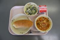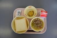 今日のこんだては、「食パン+黒豆きなこクリーム」「牛乳」「タンドリーチキン」「野菜のスープ煮」です。