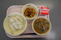 今日のこんだては、「麦ご飯」「牛乳」「きのこ豚丼の具」「サツマイモと大豆の揚げ煮」です。