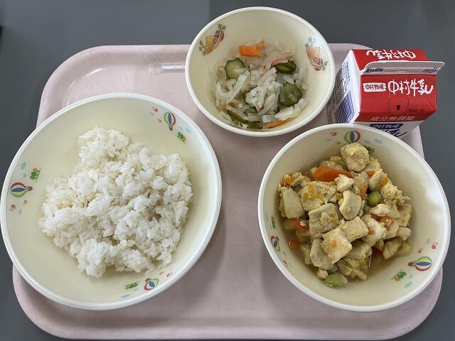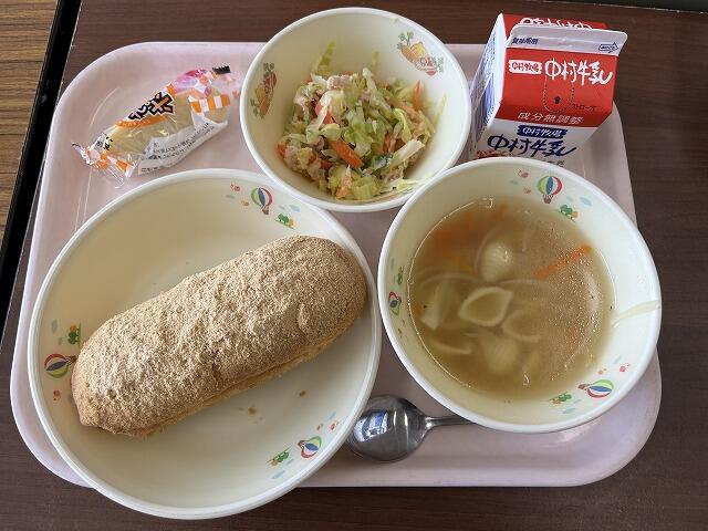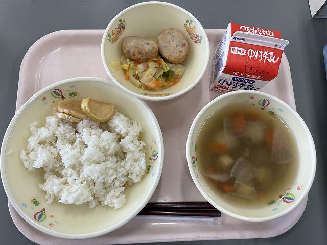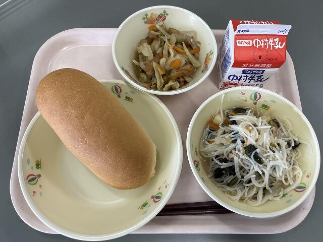 みなさん、マロニーを知っていますか?マロニーは、「じゃがいもでんぷん」を主原料に「コーンスターチ(とうもろこしでんぷん)」が配合されたものです。低カロリーの食材ですね!ふりかけも付いて、もりもりおかわりしている子どもたちでした興奮・ヤッター!