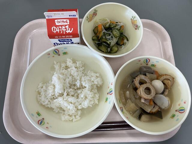 麦ご飯(おかかふりかけ) 牛乳 うま煮 マロニーの酢の物