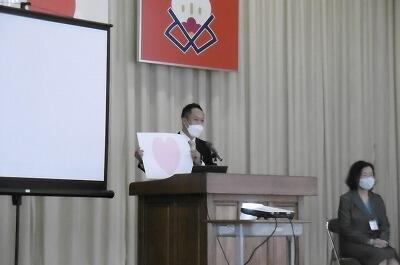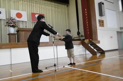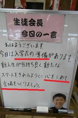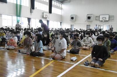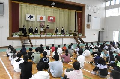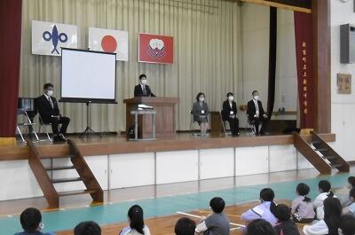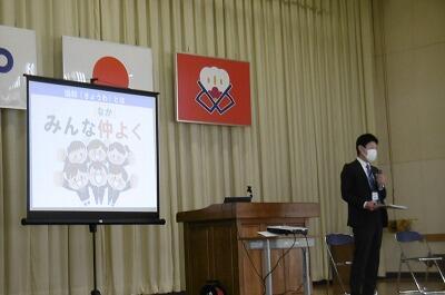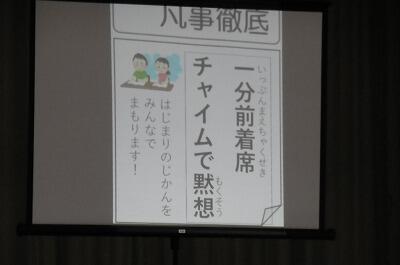 【児童代表作文発表:「分からない等の消極的な言葉を使わない」「自分で考えて行動する」「整理整頓を心掛ける」】