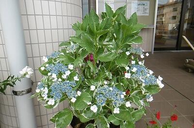 【玄関前のあじさいの花が、少しずつ開き始めていました。】