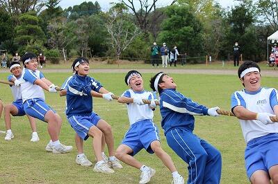 【中学部男子「綱引き」体格差で勝る白団の優勢が伝えられていましたが・・・】