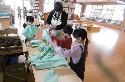 現在、担任の先生に教えてもらいながら、給食着のたたみ方を特訓中です。