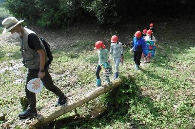 【湧き水にさわって・・。「冷たくて気持ちいい」】