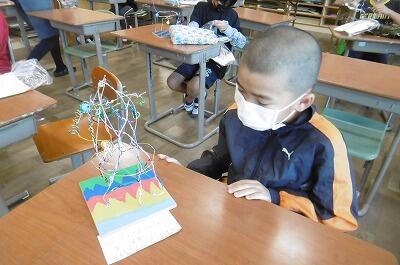 【立ち上がっていますねぇ!ペンチやドライバーを上手に使って、ワイヤーをねじったり、曲げたり、のばしたり、とってもカラフルで楽しい作品です!】