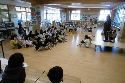 相互参観授業、PART2。まずは、1年生音楽「うたでまねっこ」の様子からです。