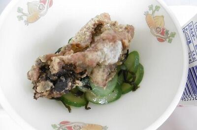 「鶏の和風揚げ」の衣には、あおさが入っていました。ほんのり磯の香りがして、とてもおいしくいただきました。