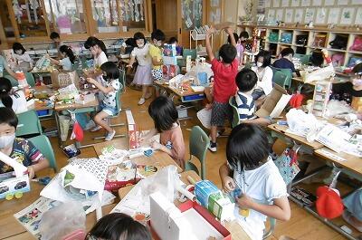 1年生教室は、子ども達が家から持ってきた箱でいっぱいに・・・。やる気満々です!さぁ、この箱を使ってどんな素敵な作品が生まれるのでしょうか?