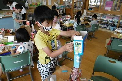 めあては「はこの形をうまくつかってつくろう」です。どこかで勉強したような・・・。