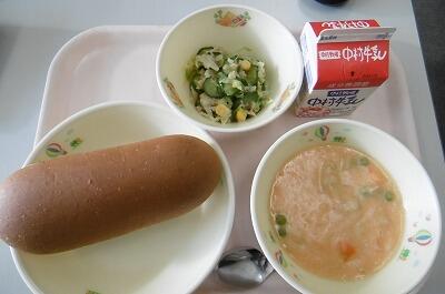 今日は、キャロットシチューが出ました。宮崎県でとれたにんじんをすりつぶして裏ごしした「ピューレ」を使ったそうです。