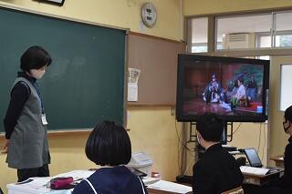 我が国の伝統と文化の尊重、国を愛する態度を学ぶために「父は能楽師」を題材に全校道徳を行いました。