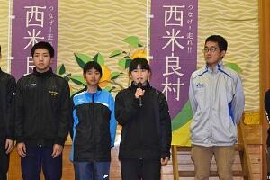 第10回宮崎県市町村対抗駅伝競走大会の西米良選手団結団式が昨日(11日)の18時から基幹集落センターで行われ、本校からは那須翼君、黒木愛莉紗さん、黒木琉偉君、那須心美さん、濵砂康生君が参加しました。康生君は選手宣誓も行いました。