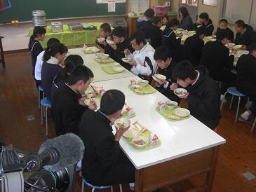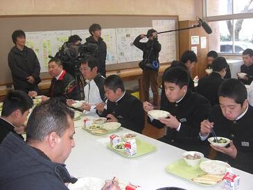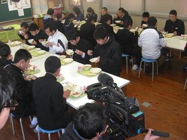 このところ、NHK宮崎放送局の方が西米良の暮らしを取材しておられます。西米良特産の糸巻き大根を取材する中で、学校給食にも使われているということで給食の様子を取材に来られました。テレビ取材の現場に居合わせることができたのもいい経験です。