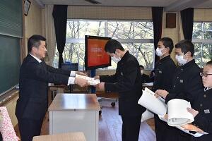 西米良村のご出身である菊池光信氏のご厚意で、毎年本校の卒業予定者の中から贈呈されている「菊池光信奨学金」が、本年度は郡山郁弥君に贈呈されました。郁弥君は生徒会長や剣道部主将を務めるなどのリーダー性を発揮してくれた生徒です。