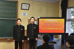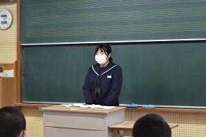 各学年代表による抱負の発表がありました。当然のことではありますが、受験目前の3年生、最上級生が迫った2年生、中学校生活のことがわかってきた1年生と、学年によって状況が随分と異なることを感じさせる発表でした。続いて、昨年と同様に「一日の計は朝にあり 一年の計は元旦にあり 一生の計は少壮にあり」という言葉を紹介して「中学生の今の時期が一生を左右するような大事な時期であること」を話しました。