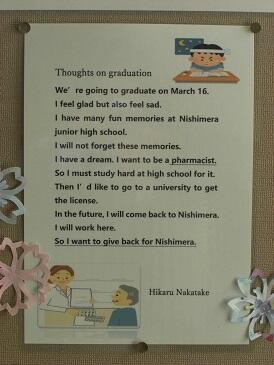 昨日、県立高校推薦入試の合格者内定発表があり、2名が合格内定となりました。他の生徒は既に第1志望の私立高校や高専に合格していますので、3年生全員の進学先が確定しました。卒業式までは実質3週間です。残りの期間を節度を保ちながら楽しく過ごしてほしいと思います。