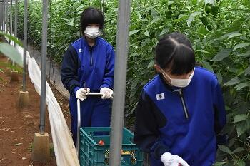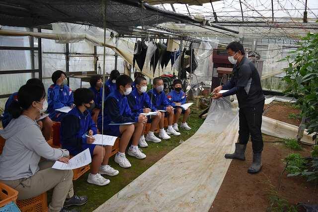 9月14日(火)、1年生による村応援プロジェクトが行われました。田爪朝幸さんのハウスにて、田爪朝幸さんよりカラーピーマン生産の工夫や努力、地域とのつながりなどについての話をしていただき、その後、実際にカラーピーマンの収穫体験をさせていただきました。