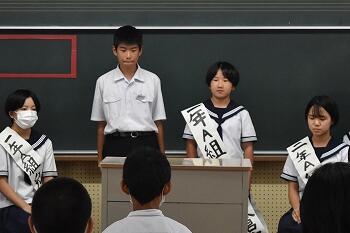 始業式では、4名の生徒が「1学期の反省」と「2学期の目標」について発表しました。2学期は1年間の中で学校行事が多く行われます。また、3年生にとっては、中学校最後の学校行事になるものもあります。最高の思い出になるように、全力で取り組みましょう。