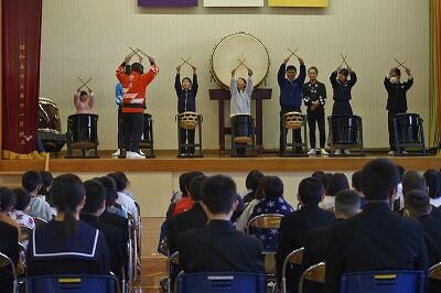 11月28日(火)に鑑賞教室がありました。今回は橘太鼓「響座」の4名の方々をお招きし、公演をしていただきました!