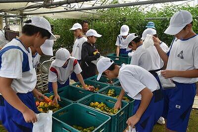 収穫体験では、ゆずの棘に気を付けながらかご9箱分(およそ200Kg)のゆずを収穫しました!生徒からは、「腕がつかれる」や「斜面で滑りそう」など実際に体験することで感じた意見を聞くことができました!!