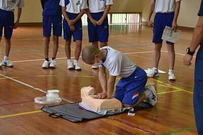 心肺蘇生の事例についての動画や資料に沿って説明を受けたあと、実際に人形を使っての実技を行いました。3年生を中心に生徒全員が命を救うことにつながるという高い意識で取り組んでいました。