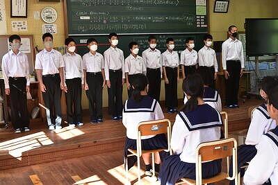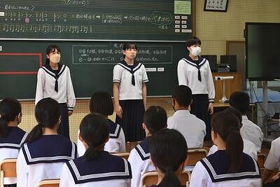 生徒会主催の歓迎式が行われました。2.3年生が学校行事や生徒会活動、シトラスリボンプロジェクトについて説明しました。また、新入生は、1人ずつ自己紹介を行い、中学校生活での抱負を述べ、それぞれの個性豊かな発表に期待が膨らみました。