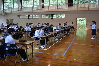 5月26日(金)に、県立高校6校、私立高校3校の先生方に来ていただき、高校説明会を開きました。1年生から3年生までの全校生徒と保護者も多数参加されました。