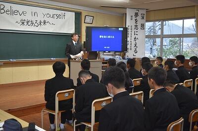 後半の部では、元西米良中校長の末吉豊文先生をお招きし、「夢を志に変える」という演題で講話をしていただきました。さまざまな場面で人との繋がりが大切であることに改めて気づくきっかけとなる講話でした!