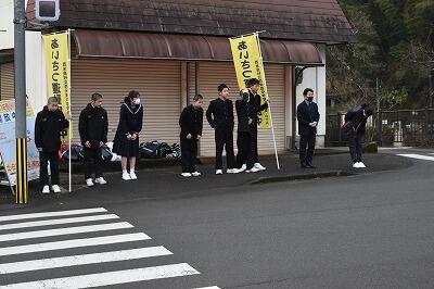 日頃から学校道を通る車へ挨拶をしていますが、この期間は一番人通りの多い交差点でのあいさつ運動を行っています!