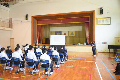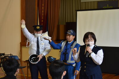 自転車の走行、乗り方、点検の仕方など、自転車の安全について話をしていただきました。生徒たちは、豆腐を子どもの脳と見立てた実験や、”ブタベルサハラ”をキーワードとした点検の仕方が特に印象に残ったようです。