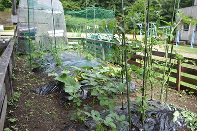 5月初旬に2年生の技術で苗を植えた、トウモロコシ、ミニトマト、カボチャ、枝豆、ゴーヤがこんなに大きくなりました。ミニトマト、枝豆は実をつけ始めました。これからも生長が楽しみです。
