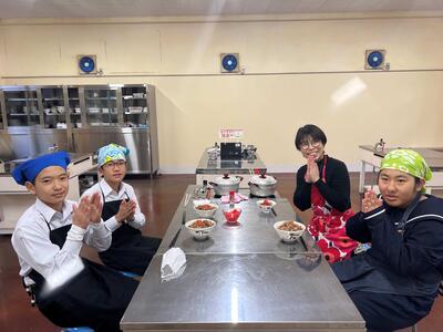 今回のメニューは、「牛丼」。事前に家庭で練習してきた生徒もおり、手際よく調理することができました。