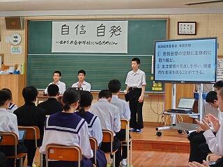 公開授業は、総合的な学習の時間の内容で、1学期から調査してきた内容をデジタルポスターセッションで発表しました。発表後には、1・2年生や参観された方から提案に対する質問や意見をいただきました。一つ一つの質問に、その場で一生懸命回答を考える3年生の姿にとても関心しました。また、村民ゲストとして来てくださった地域の方からは、具体的なアドバイスや鋭い視点からの質問をいただくことができました。新たな発見や気づきに生徒たちも納得!でした。お忙しいなか公開授業にお越しいただきました皆様、本当にありがとうございました。