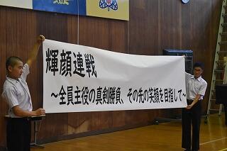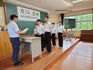激励会では、3つの部活動のキャプテンが抱負を述べた後、男子ソフトテニス部キャプテンが選手宣誓を行いました。