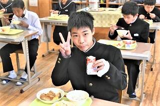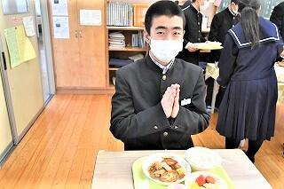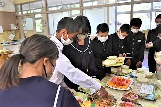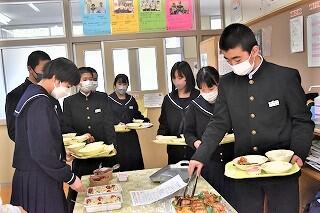 2月28日(火)の給食は、西米良伝統、年1回の「バラエティ給食」でした。いろいろなおかずが大皿に盛ってあって、生徒たちは、自分のお盆に食器をのせてテーブルを回りながら取っていきます。もちろん、好きなおかずを独占することできません。(数が決まっています。)それでも、まるでホテルのバイキングみたいで、生徒たちはとても楽しそうでした。