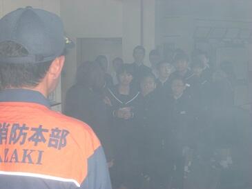 消火体験では水消火器を上手に扱って、短時間で的を倒すことができました。また煙霧体験では、体験用の煙で一杯の被服室を腰をかがめて、片手はハンカチで口を覆い、もう片方の手は壁をつたわせて避難路を確認しながら進む体験をしました。