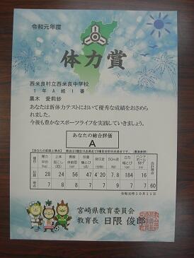 県教育委員会が実施した「新体力テスト」で総合評価Aの体力賞を受
