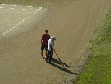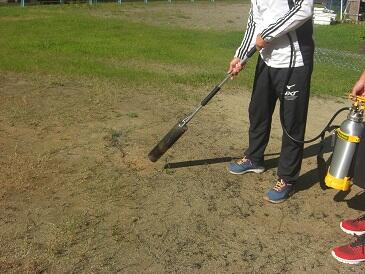 本校の仁田脇教諭が自宅から持って来た道具を使って、グラウンドの雑草の処理をしています。前もって、自動車で金属の器具をけん引して回っていたので雑草は枯れつつあり、炎天下でよく燃えます。
