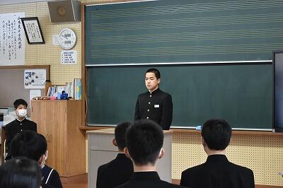 1時間目の始業式では、代表生徒が、「周りを見て、気を利かせた行動ができるようになりたい。」「3年生になるので、将来を見据え、考えて行動できる人になりたい。」「輝くゴールを切るために、苦手教科を克服し、得意教科をさらに伸ばしていきたい。」「日々の生活を大切にして、仲間や後輩たちとともに楽しい思い出を作りたい。」等、新年の抱負を堂々と述べてくれました。