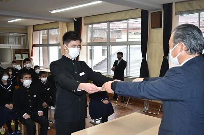 12月23日は、2学期の終業の日でした。終業式では、各学年の生徒代表の生徒が、「これからもチャレンジ(挑戦)を続けていきたい」「考えたことを行動に移すことができるようになった」「団長を務めたり、神楽を舞うなど貴重な経験をした」「次の学年の0学期をしっかりと過ごしたい」など、2学期を振り返るとともに、3学期・新年の目標を堂々と発表してくれました。その後、校長先生の話があり、各担当の先生方が冬休みの過ごし方について話をされました。終業式終了後に、各種大会やコンクール等の表彰式を行いました。