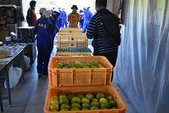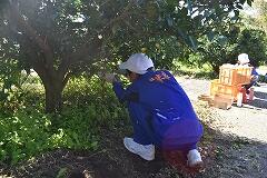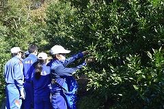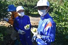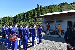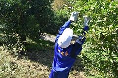 竹原地区の高台にあるゆず団地に着いてまず感じたのは、そこからの景色の素晴らしさ、同時に、そこで働かれている方々のご苦労も様々あるだろうということです。はじめにゆずについてお話をしていただき、いよいよ収穫体験をしました。何と言っても気を付けなければならないのが、濵砂さんからの注意にもあった、ゆずの木の鋭いとげで、ゆずの実、それ以上に自分の体を傷つけないことです。みんな、高いところ、低いところ、葉の影など、一生懸命探しながら収穫していました。西米良村を代表する特産物のゆずについて、身をもって学習することができました。