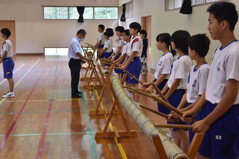 7月16日(金)、4校時に4回目となる米良太鼓の練習を行いました。本日は、指導者として濵砂 道太氏、黒木 靖隆氏より指導をしていただきました。お忙しい中、ありがとうございました。