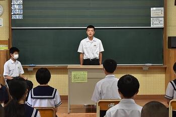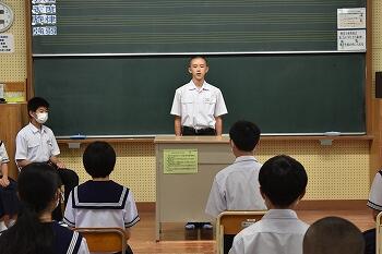 始業式では、4名の生徒が「1学期の反省」と「2学期の目標」について発表しました。2学期は1年間の中で学校行事が多く行われます。また、3年生にとっては、中学校最後の学校行事になるものもあります。最高の思い出になるように、全力で取り組みましょう。